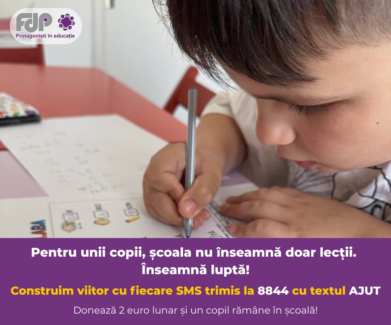 Construim viitor cu fiecare SMS cu textul „AJUT” la 8844, pentru ca fiecare copil să rămână în școală.